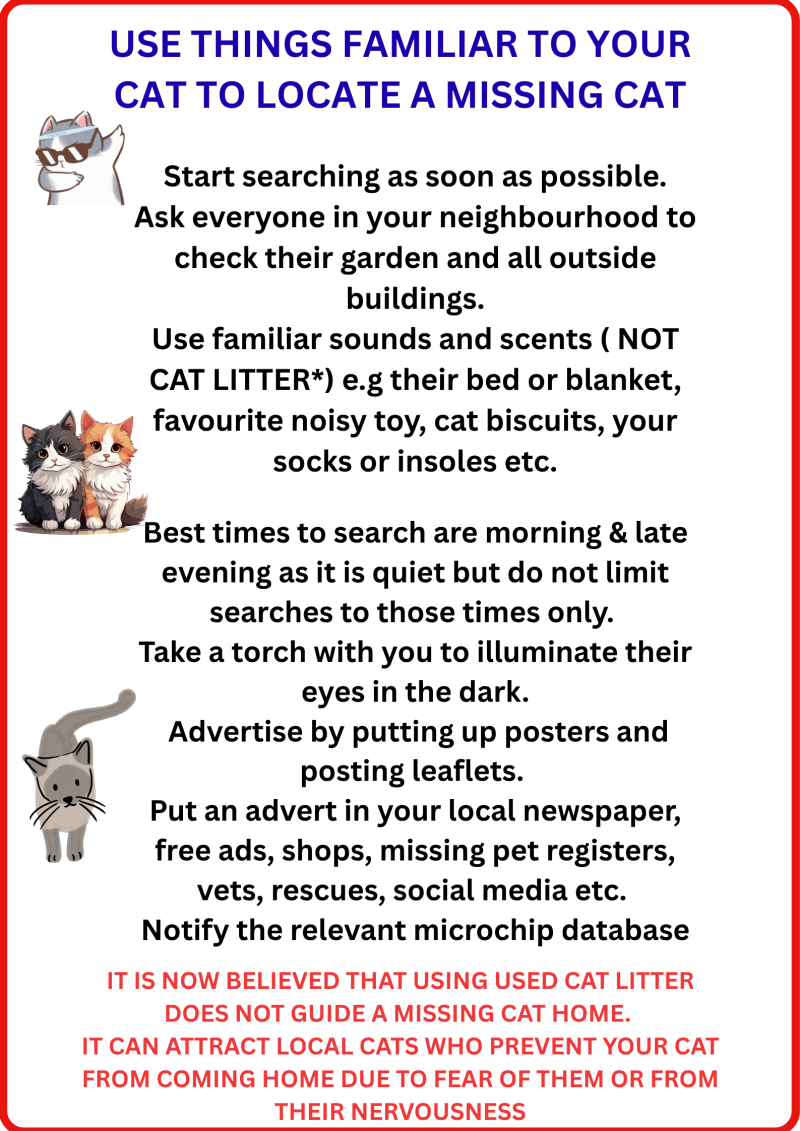 Once you make contact with a search and rescue team in your area they will look at the circumstances as to how your pet went missing and will advise/help accordingly .