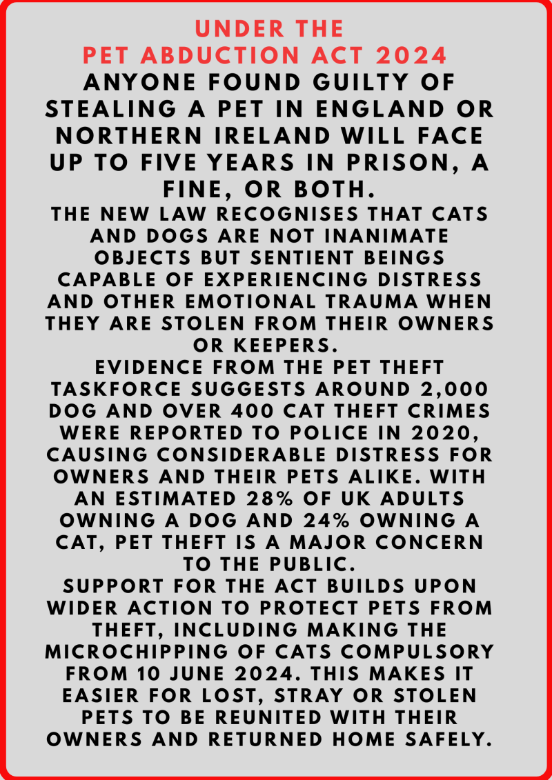 THE PET ABDUCTION ACT 2024 is now in force but please note the ridiculous flaw in teh legislation which affects both dogs and cats .